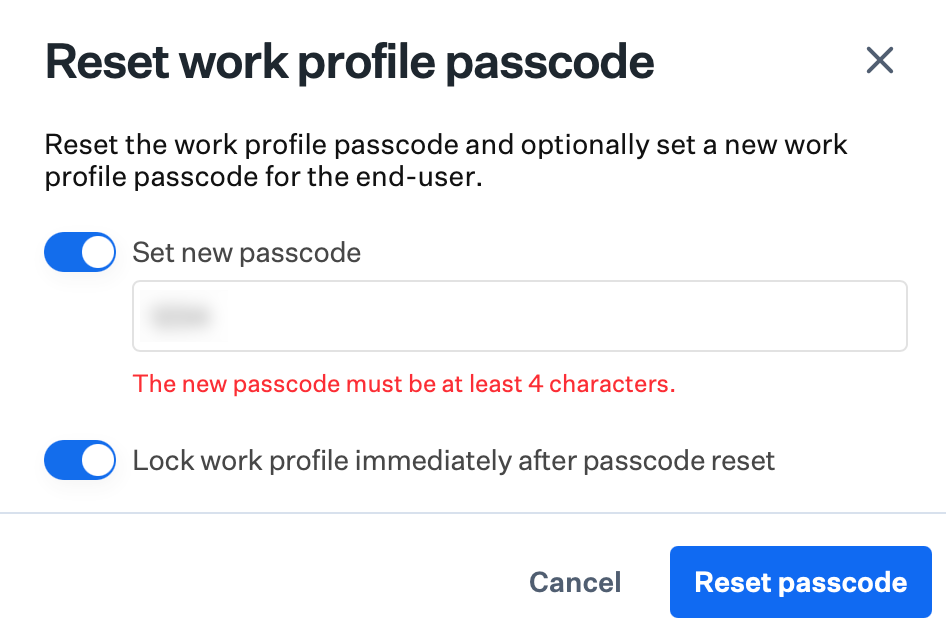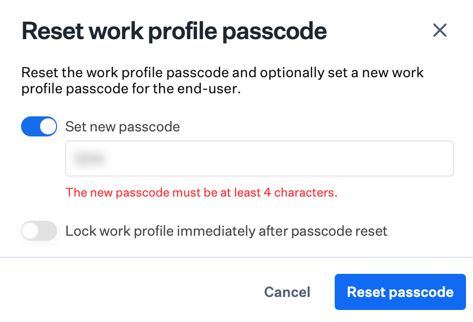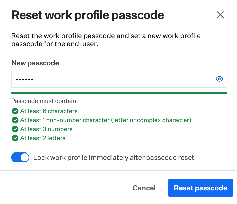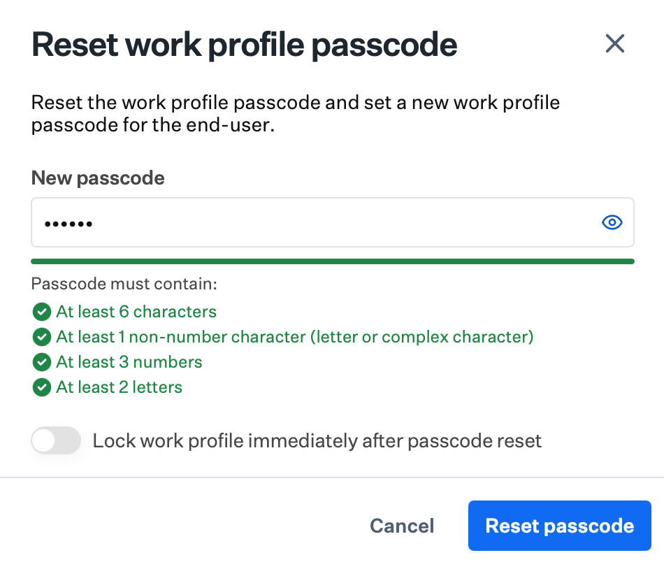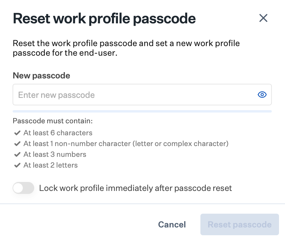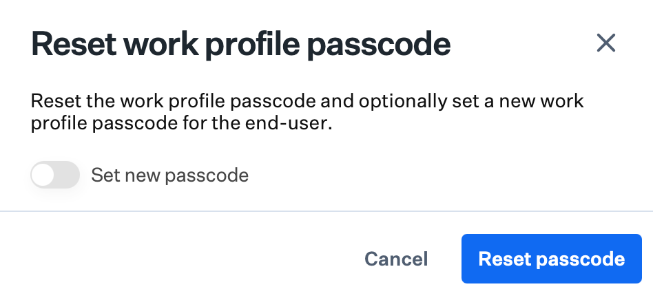 To reset the work profile passcode only, leave Set new passcode off and click Reset passcode to send the command.