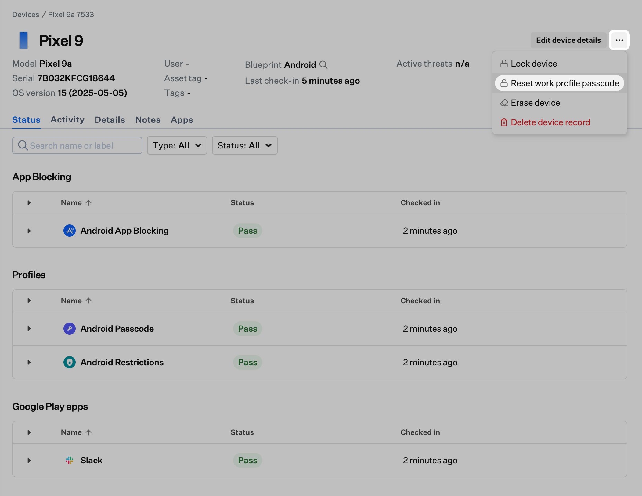 When no Android Work Profile Passcode Library Item is assigned to the device, you can reset the passcode and optionally set a new one. To enforce stricter requirements, assign the Android Work Profile Passcode Library Item.Open Device Action Menu