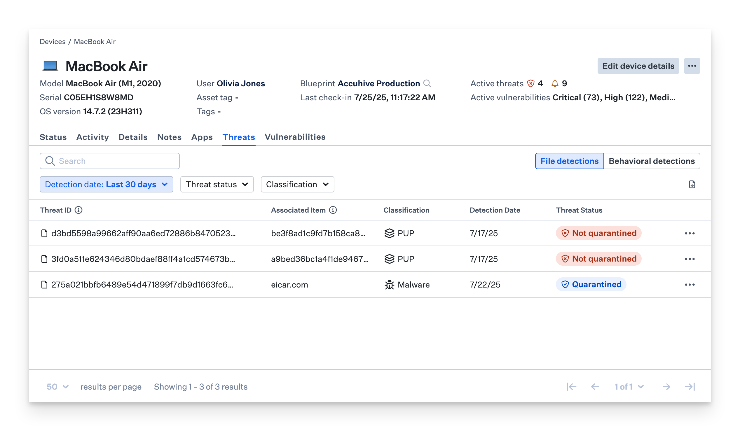 - Device-Specific Views: Access detailed threat information for individual devices through the device record page Threats tab
