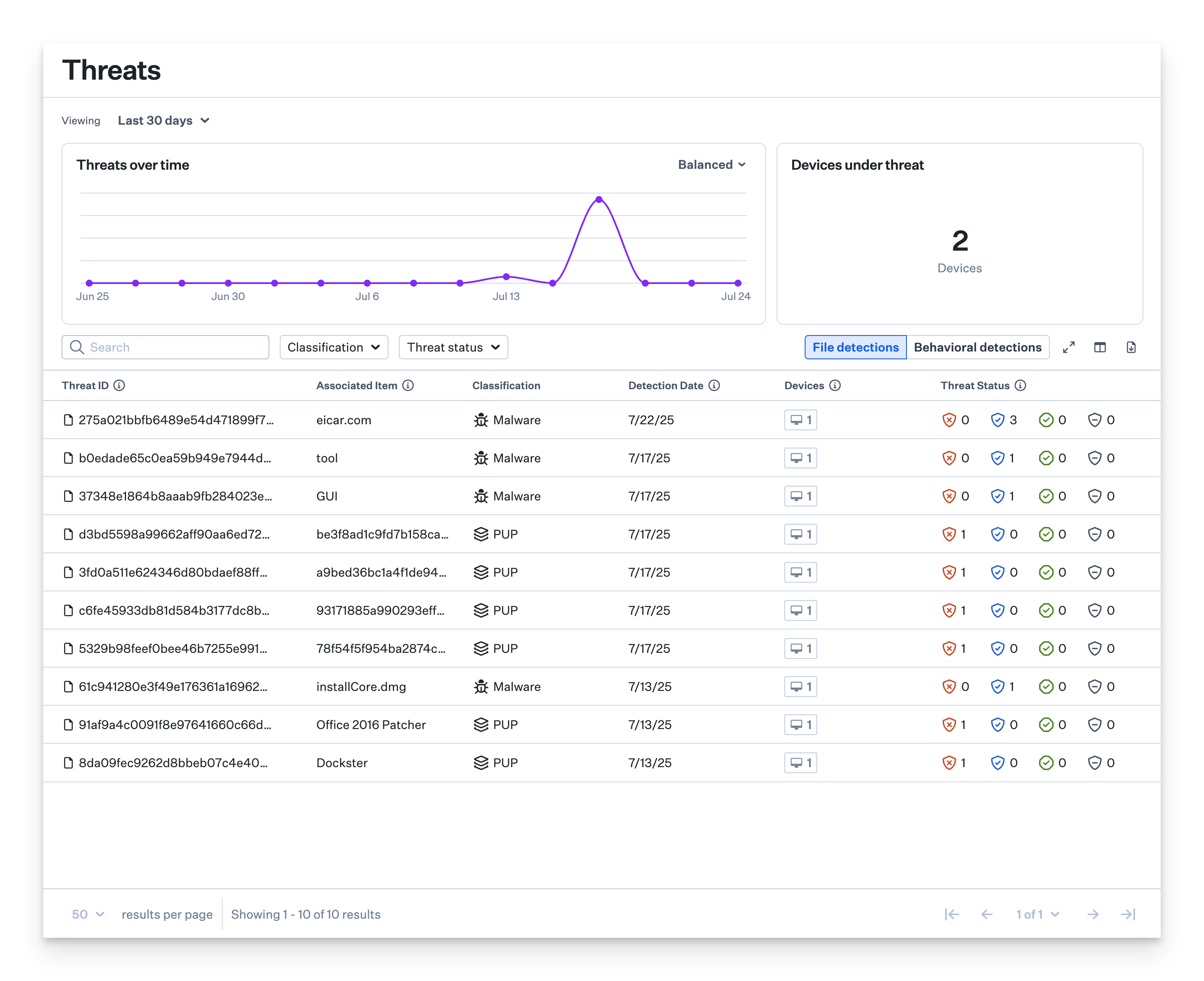 - Threat Classification: File detections are categorized as malware, PUPs, benign, or unknown, while behavioral detections are classified as malicious or suspicious