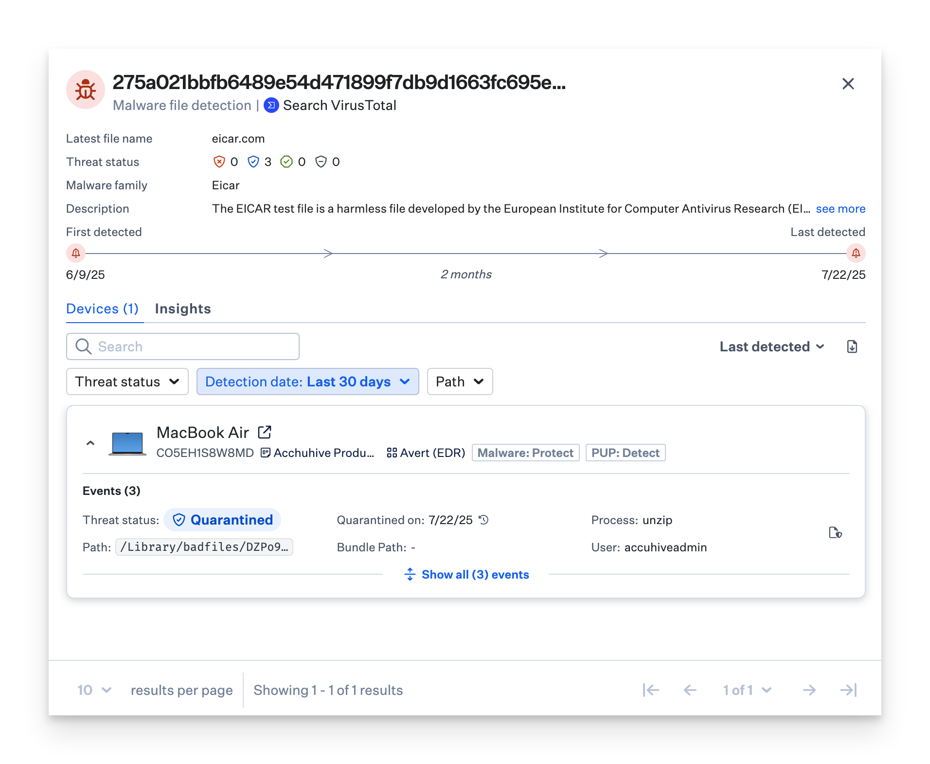 Click on any Threat event to reveal additional information, including detection and quarantined dates, path, file hash, and user information. Similar data is available on the device record page for individual devices.