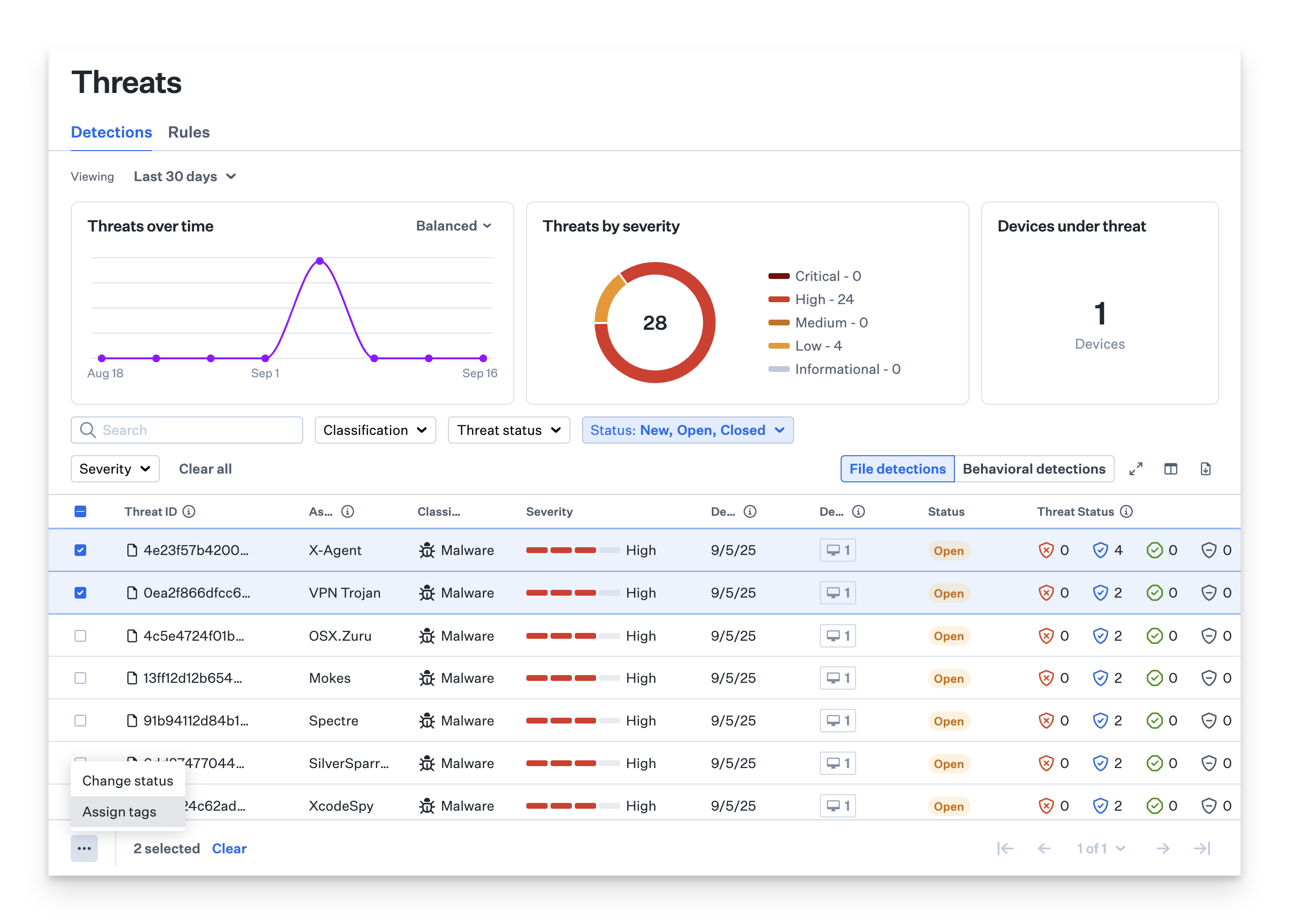 Security Operations actions provide a structured approach to threat management through status tracking and tagging systems. The Status action on the Threats page of Endpoint Detection lets you track and update detection events as you work through them. As an admin, you can manually mark detections as Open or Closed, while Iru Endpoint automatically assigns other statuses based on timing, such as when the detection first occurred or how long it’s been resolved. This creates a consistent workflow that helps you see what’s new, what needs attention, and what’s been handled, making it easier to triage threats and track progress across your fleet. The Status column is available in both File Detection and Behavioral Detection tables..png?fit=max&auto=format&n=UzJ56q8TtGBboKzK&q=85&s=ddbc0fb77316e49b65330f0aa09ea791)