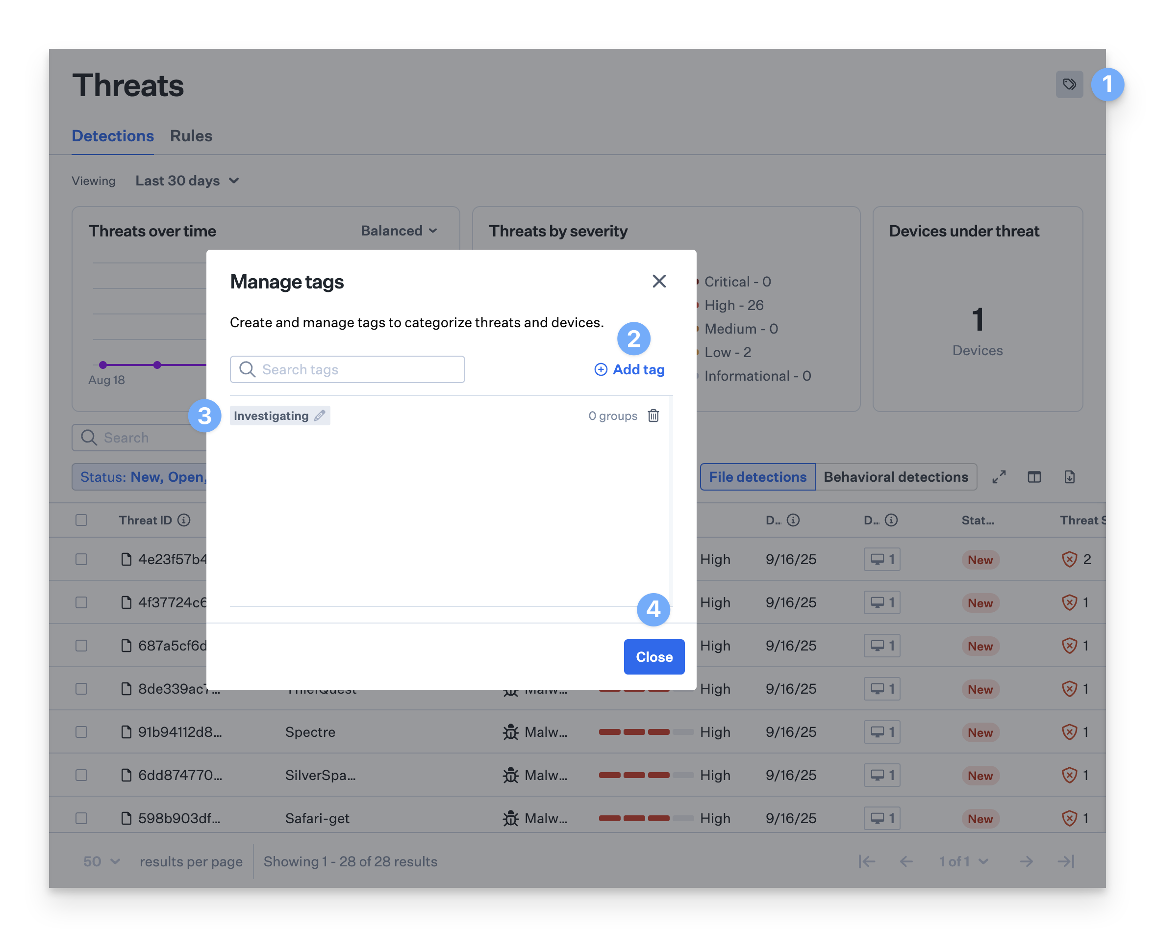 Select the Manage Tags icon in the upper right-hand corner of the Threats page.