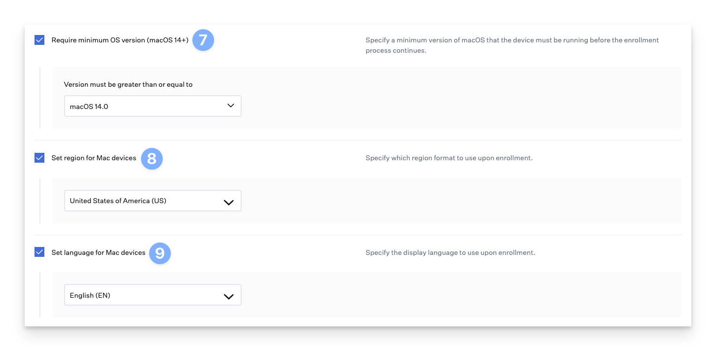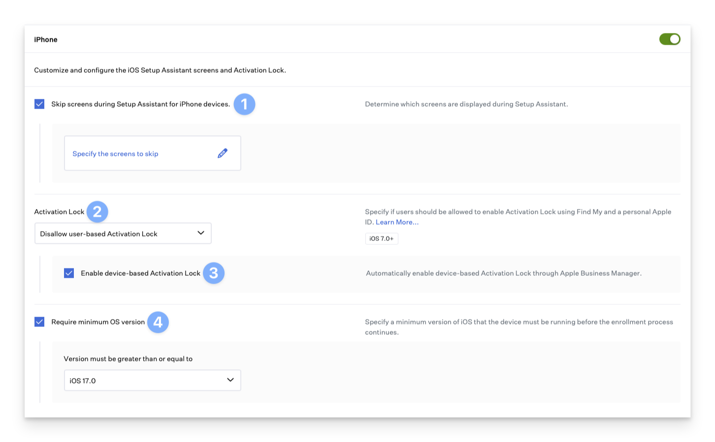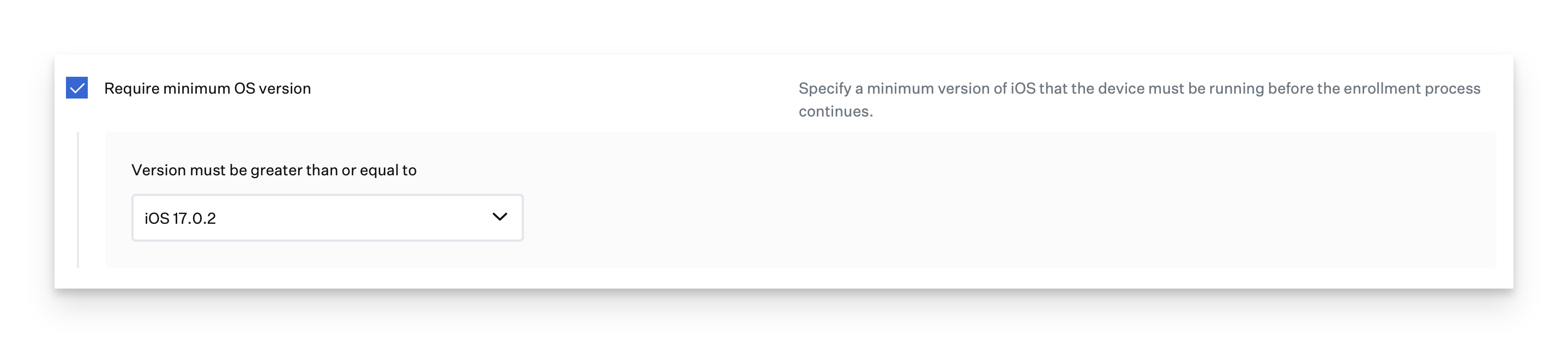 In addition to the settings described below, Mac, iPhone, and iPad devices running macOS 14.0 or later or iOS/iPadOS 17.0 or later can be forced to update their OS beyond those versions before enrolling into Kandji. They must already be on at least those versions before any updates can be enforced. Requiring a minimum OS version does not affect enrollment for devices running older OS versions. Use the setting Require minimum OS version in each device type’s settings as shown below to enforce the update to the version you want to require. Note: these settings do not affect any Managed OS settings you have set for after enrollment; macOS and iOS/iPadOS enforce these updates directly in Setup Assistant before enrollment so that applicable devices enroll already up-to-date. Changing this setting for a specific device type is immediate and does not require resyncing ADE settings to Apple.