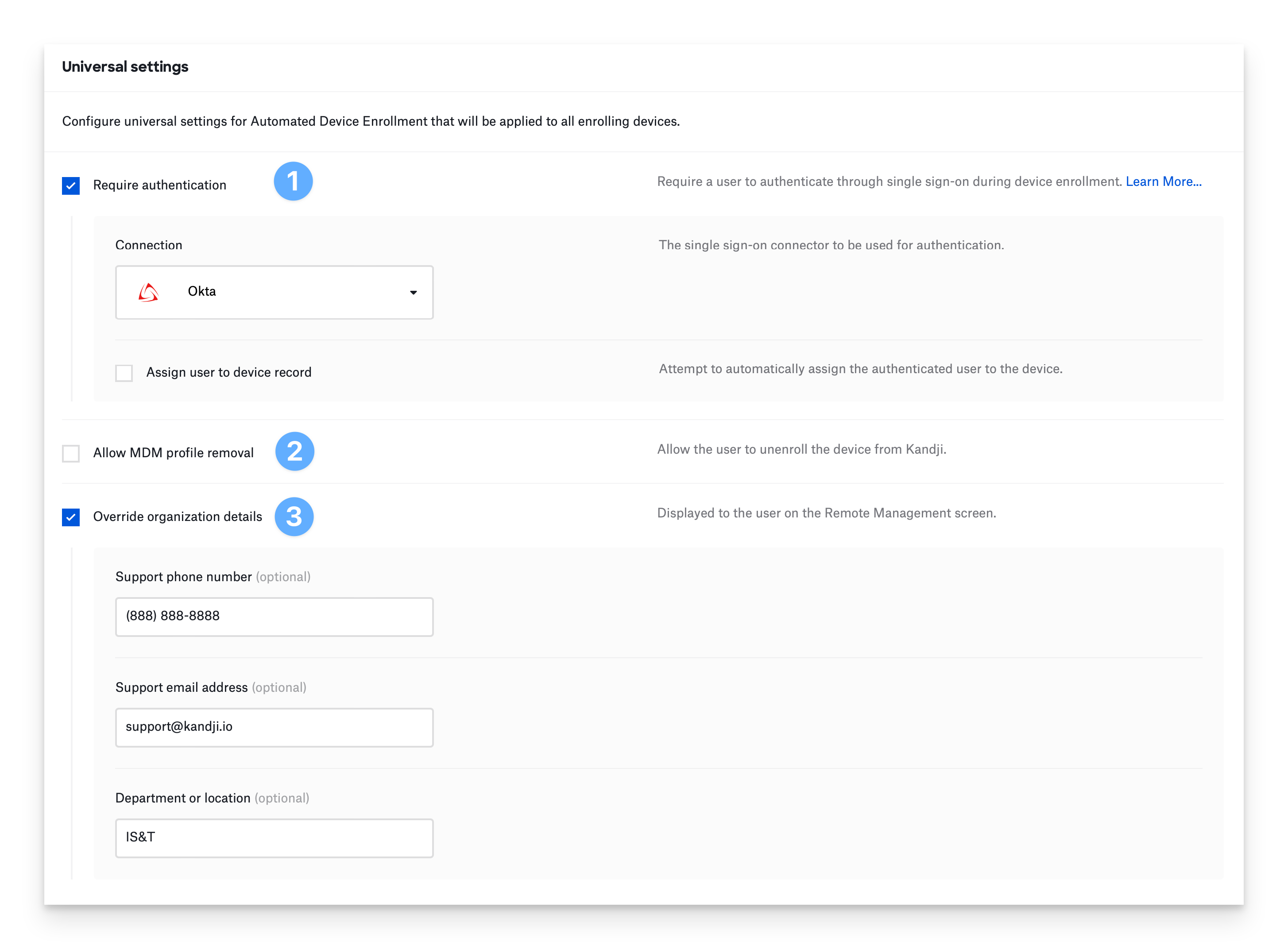 - The Require Authentication option within the Automated Device Enrollment Library item allows admins to require users to authenticate with an identity provider (IdP) before allowing the device to proceed with enrollment.