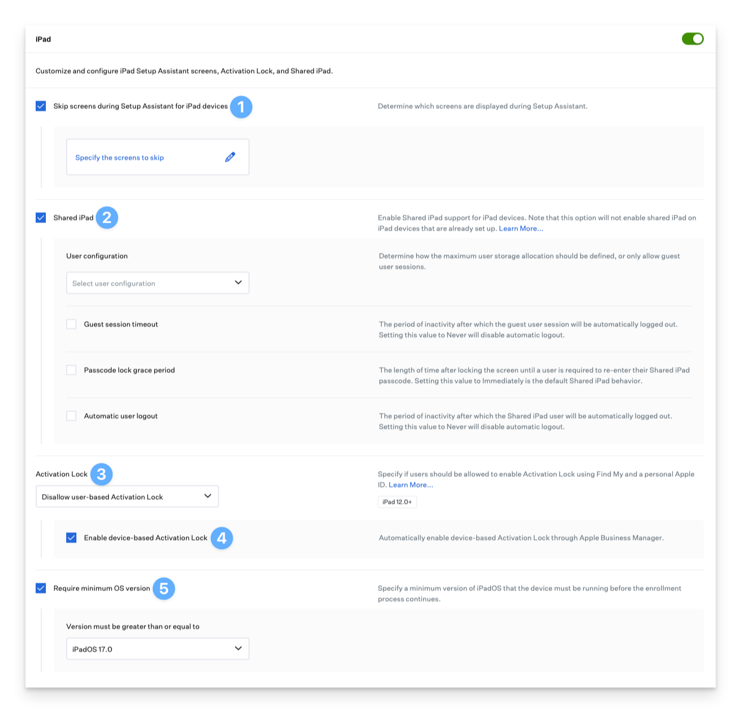 Customize the setup experience and configuration for iPad devices. It is recommended not to skip the Location Services unless your organization has a specific need. Location services are leveraged to set the Time Zone and other location-dependent settings.Configure Setup Assistant screens