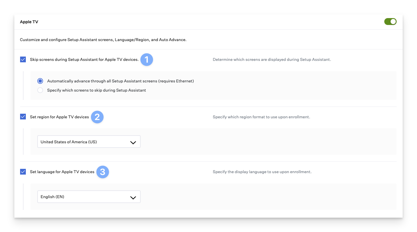 Customize the setup experience and configuration for Apple TV devices. Optionally configure Auto Advance, and specify the Language and Region.Configure Setup Assistant screens