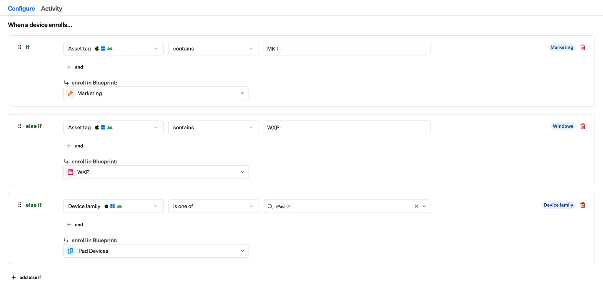 Blueprint Routing rules are only evaluated during enrollment. For ongoing dynamic configuration management, see Using Conditional Logic in Assignment Maps. Blueprint Routing decides which Assignment Map a device should be assigned to, and conditional logic within an Assignment Map decides which Library Items the device should receive.Blueprint Routing Activity
