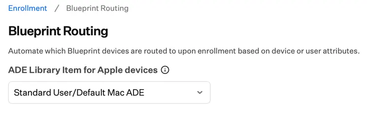 Rules are evaluated just in time during enrollment, so you don’t know the destination Blueprint until the device enrolls and device and user information is collected. To configure ADE settings for those devices, set the ADE Library Item to use in the Blueprint Routing config itself (see the optional step in Configuring Blueprint Routing).Assignment to Blueprint Routing persists across re-enrollments until the device’s awaiting enrollment record is set to a different Blueprint.