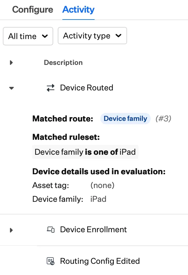 - Routing actions taken against devices enrolling through Blueprint Routing, including the ruleset that matched and the device information available to Iru at the time the routing decision was made