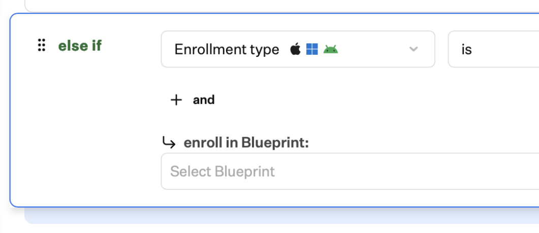 Blueprint Routing uses blocks of Assignment Rules, similar to Assignment Maps. During enrollment, Iru evaluates initial device and user information against those rules and routes devices to the matching Blueprint. You get a single enrollment entry point across all platforms.Configuring Blueprint Routing