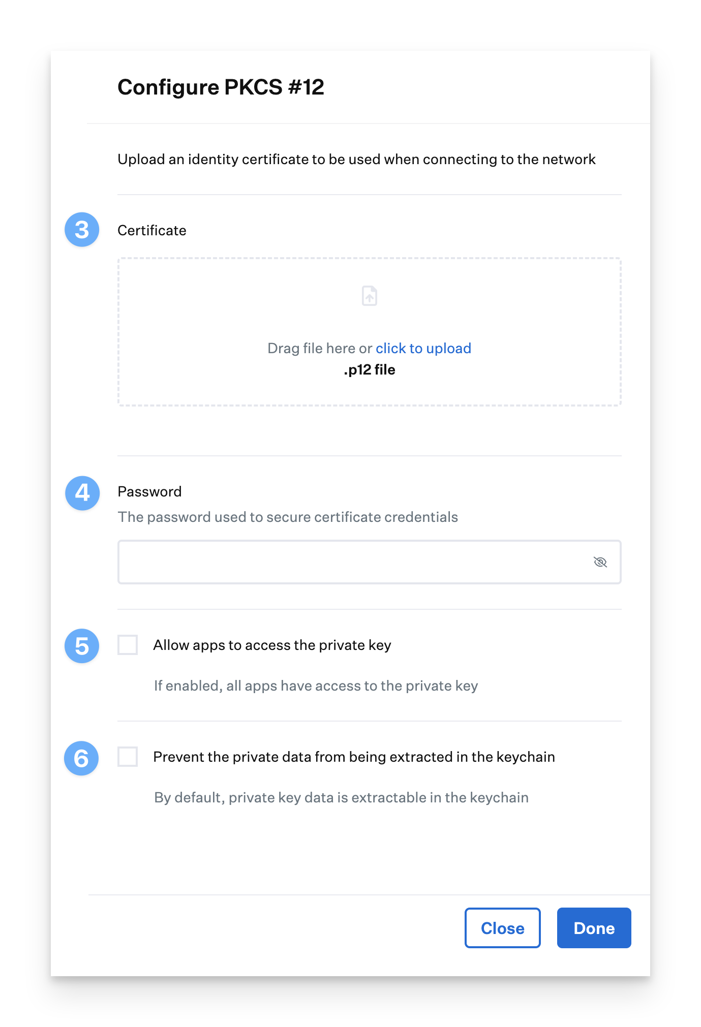 If you want apps to access the private key of the certificate, select Allow apps to access the private key. If you do not want the user to be able to export the private key using the keychain, select Prevent the private data from being extracted in the keychain.