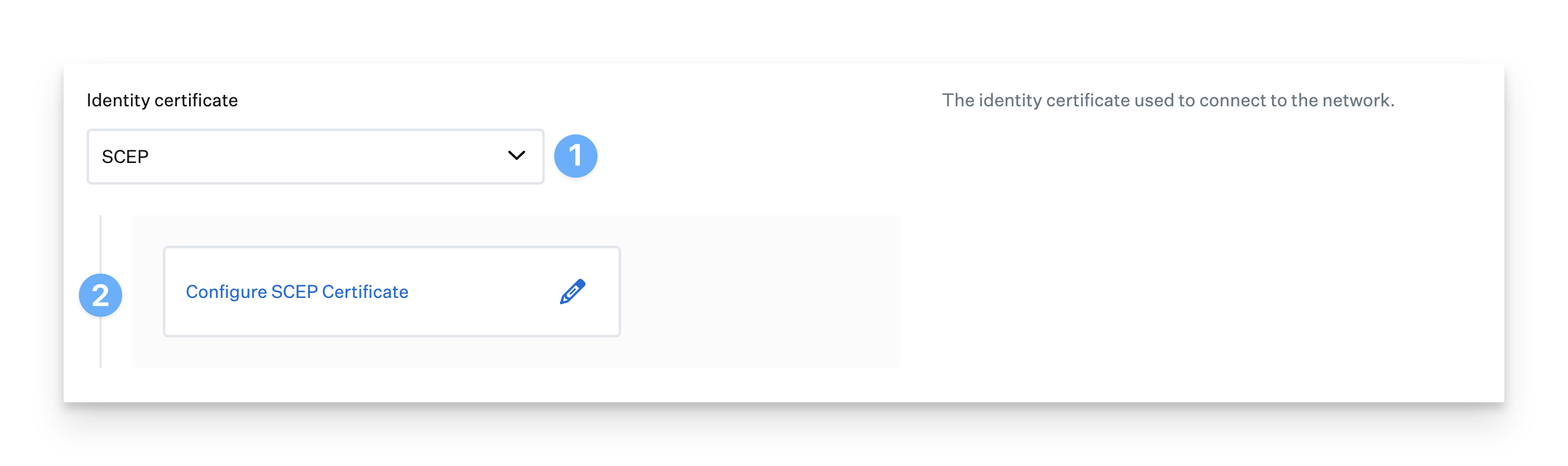 If you wish to have the client device acquire an identity certificate from a SCEP service, choose SCEP for an Identity certificate.