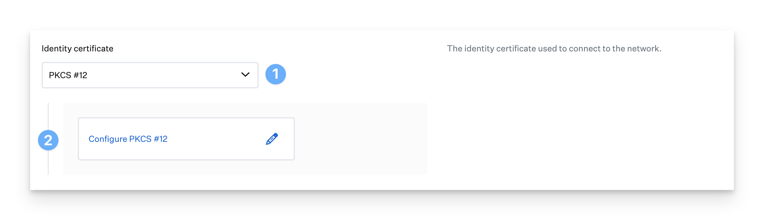 You can provide a single identity certificate for all configured devices by uploading a PKCS #12 formatted file. This means all devices will use the same certificate, making it harder for network administrators to identify individual devices by their login. However, it also means that if the certificate is compromised, it can be used to access the network. Revoking this certificate will block all configured devices from accessing the network.1