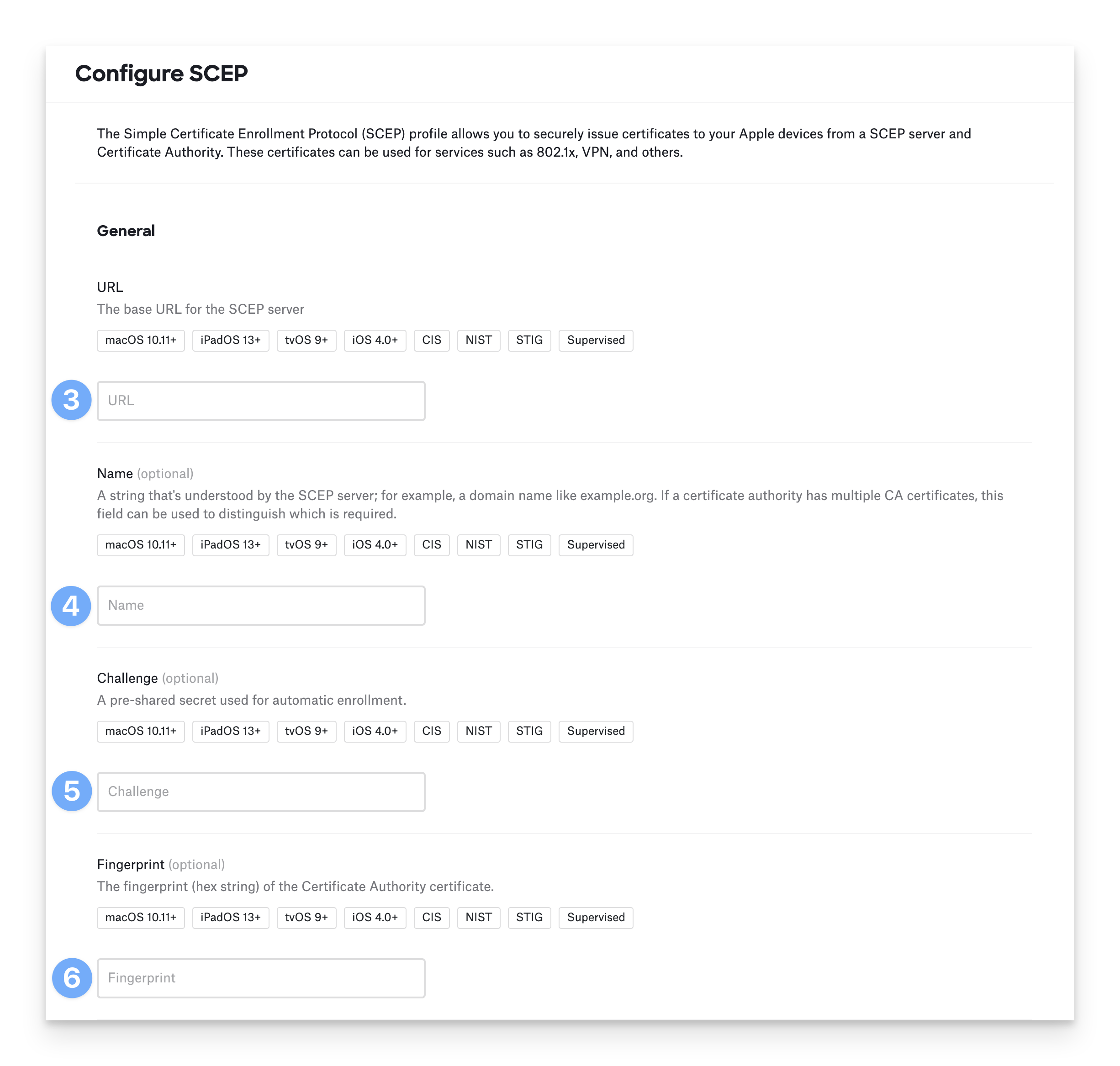 Enter the URL for the SCEP server for URL. Optionally, specify a Name as needed by your SCEP server — usually the name of the CA where the SCEP service is requesting a certificate. Optionally, enter the pre-shared key as the Challenge the SCEP server expects. Optionally, enter the expected Fingerprint of the certificate authority’s certificate.
