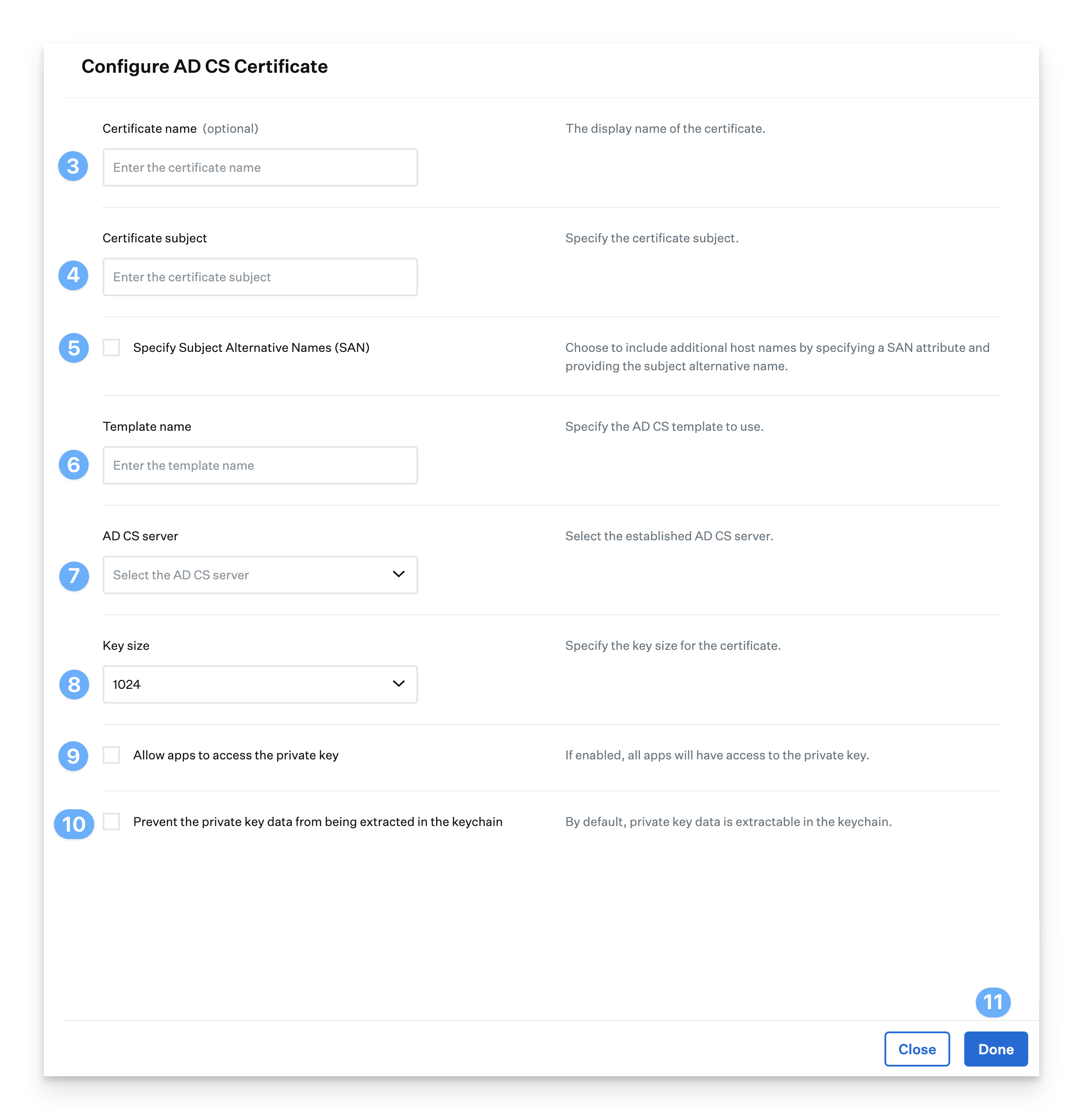 You can obtain identity certificates using Microsoft Active Directory Certificate Services (AD CS).To deploy AD CS certificates via Iru Endpoint, the AD CS Integration must first be configured.