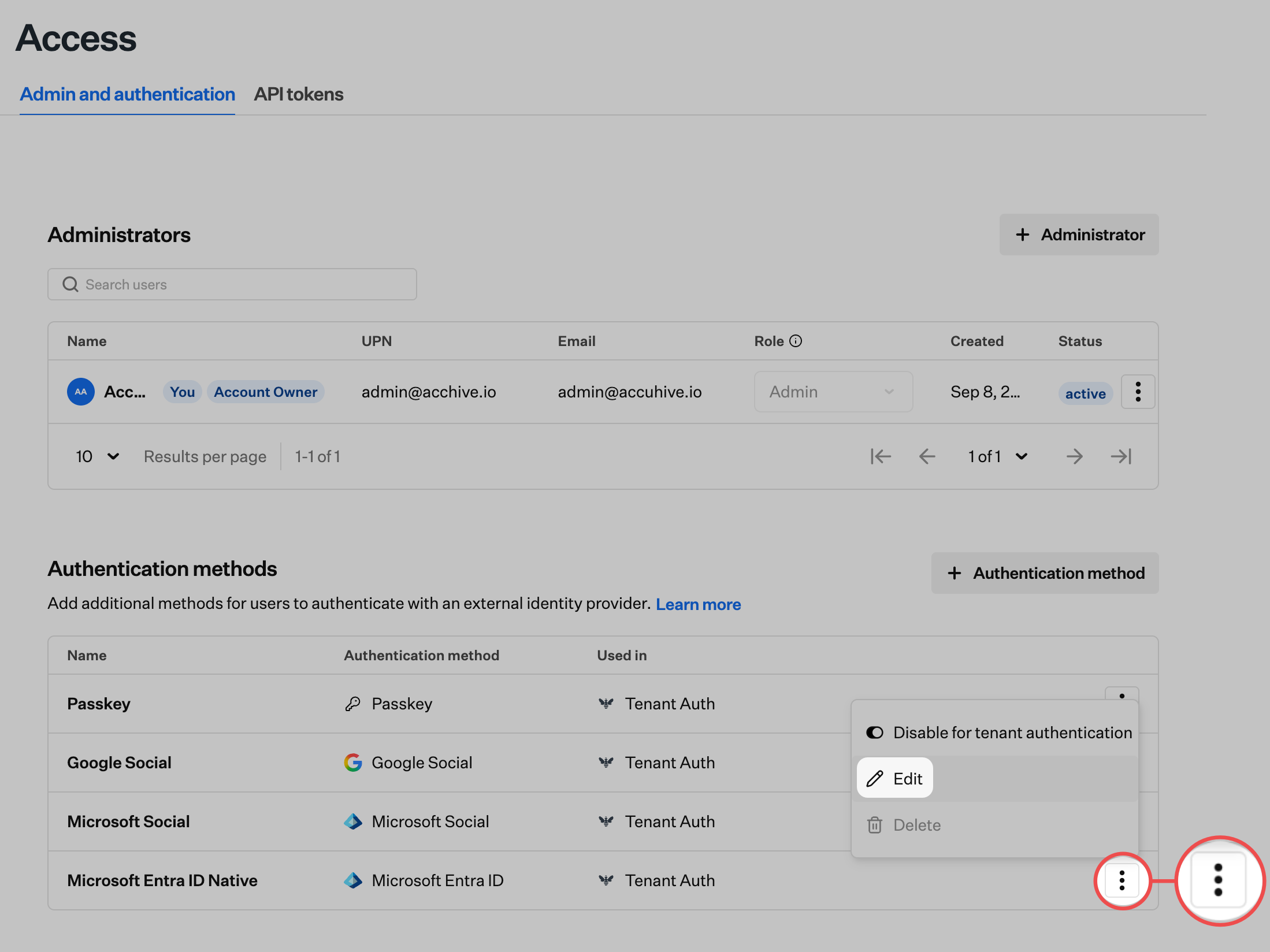 Select the Admin and authentication tab (selected by default) and scroll down to Authentication methods.