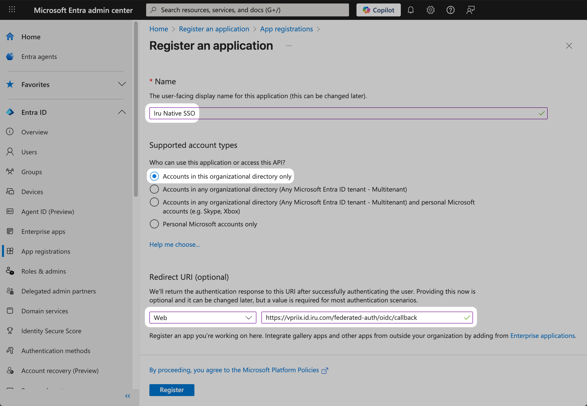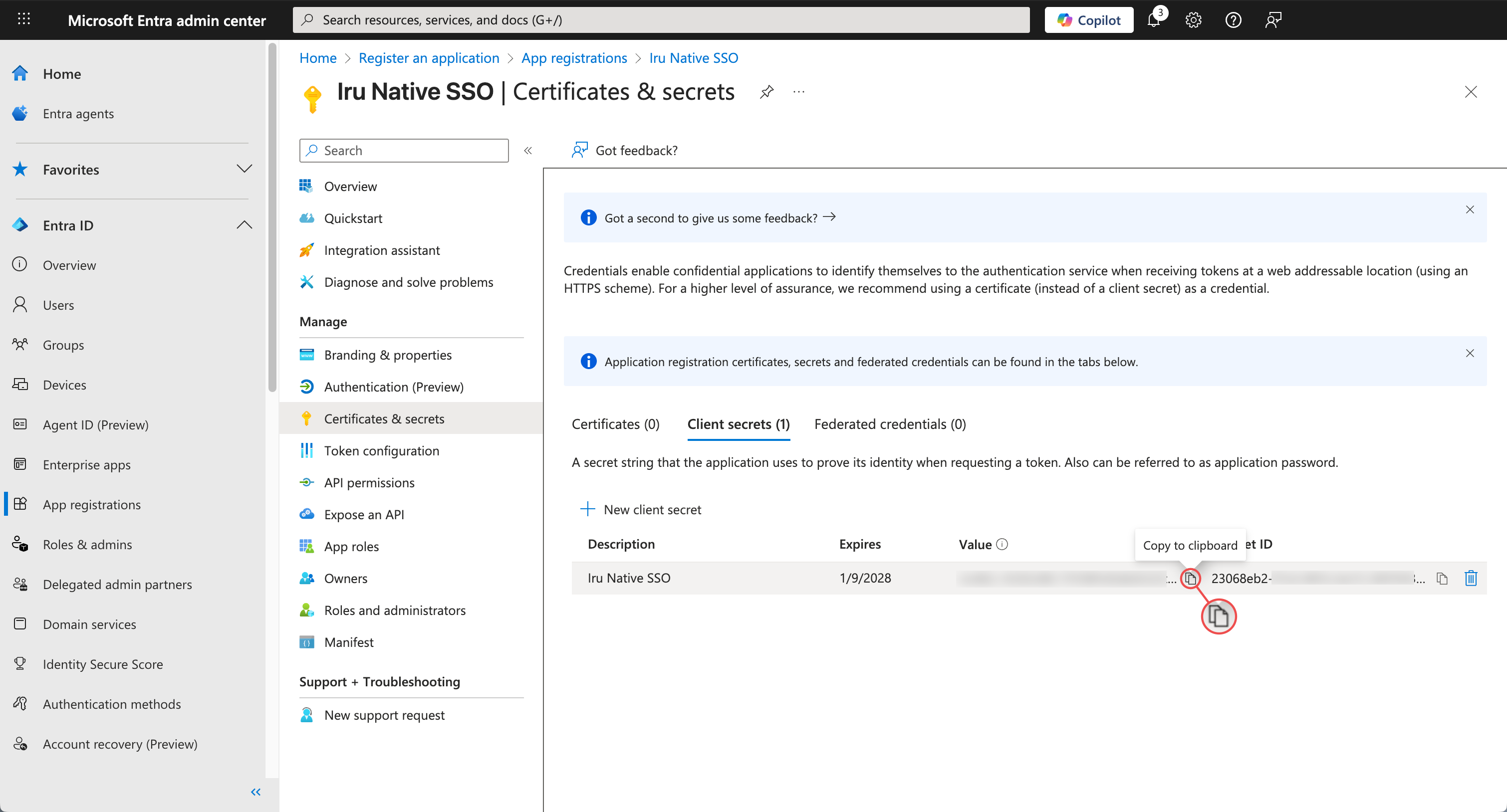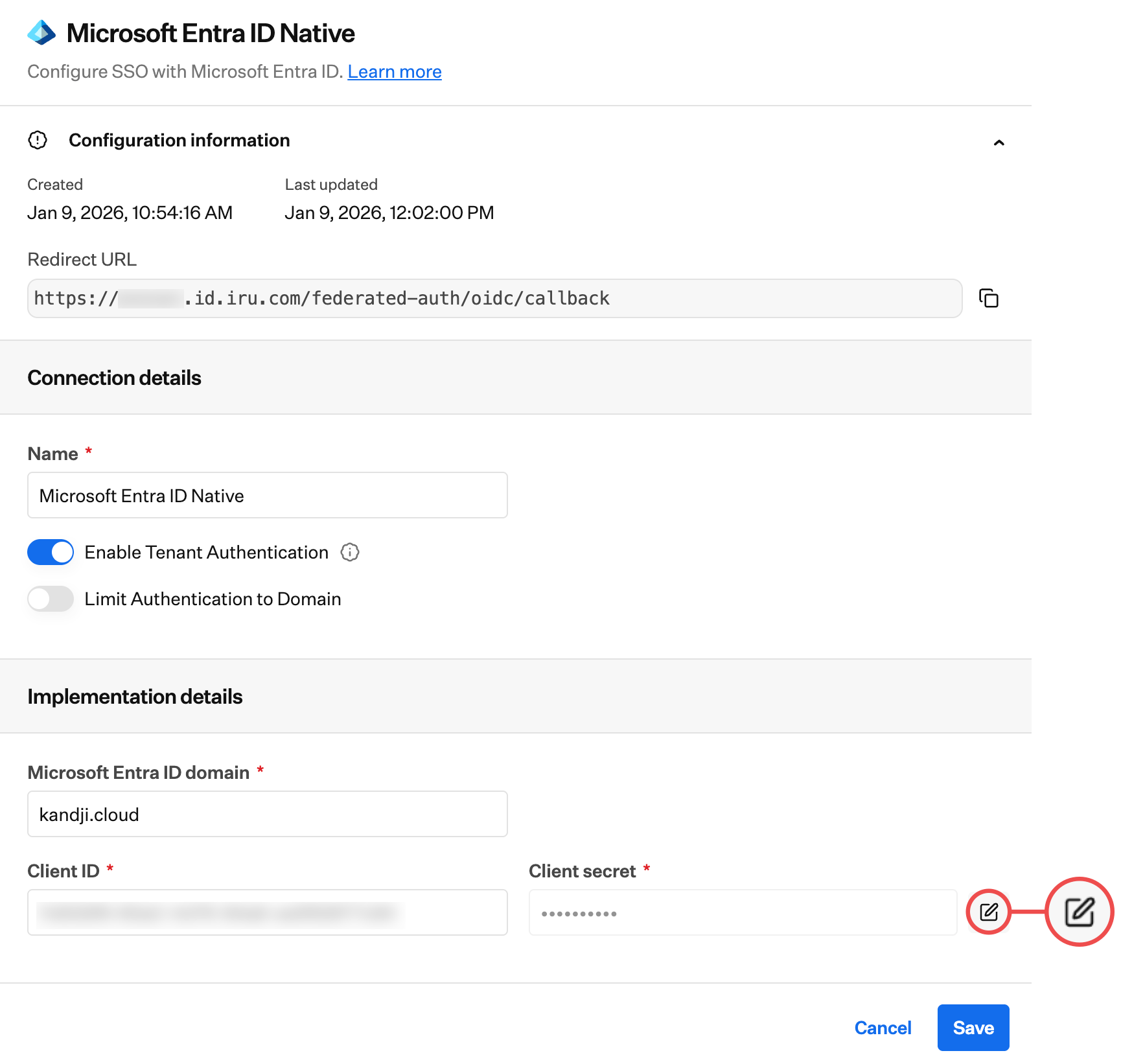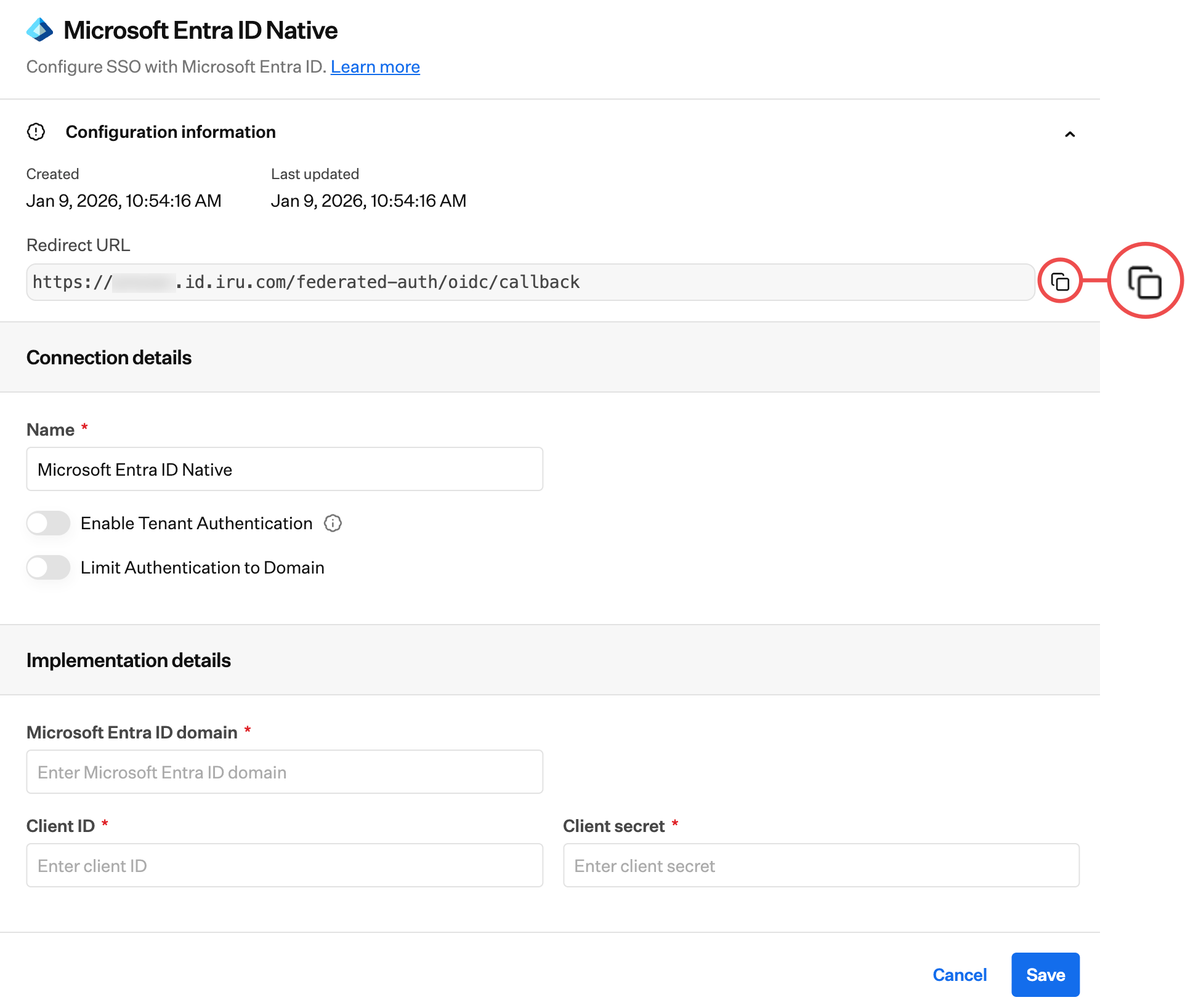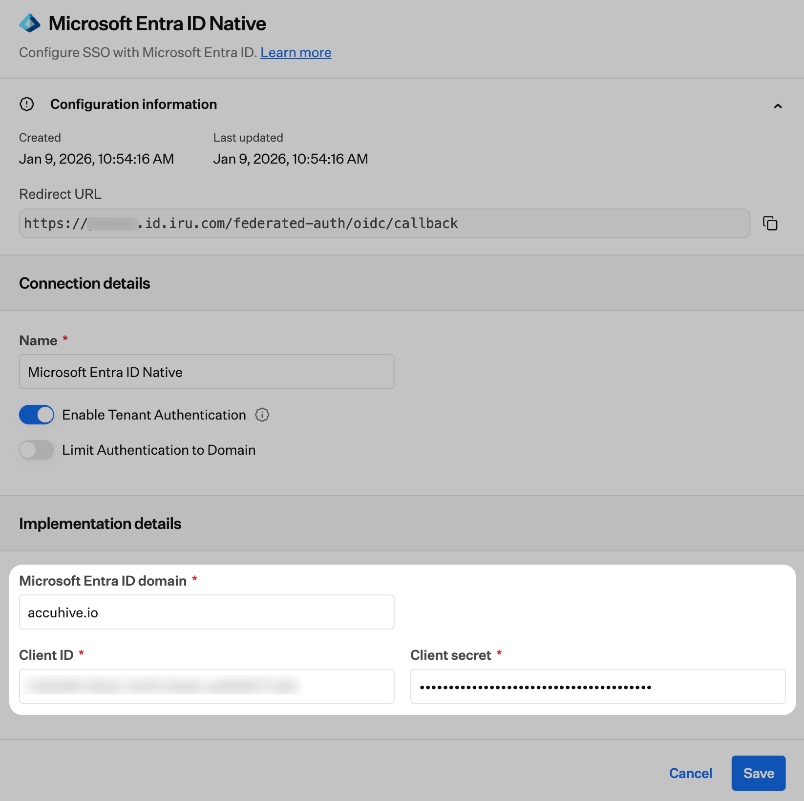 After completing the Microsoft Entra ID configuration, return here to finish setting up the SSO connection in Iru Endpoint. You’ll need the Client ID and Client secret you copied from Microsoft Entra ID.