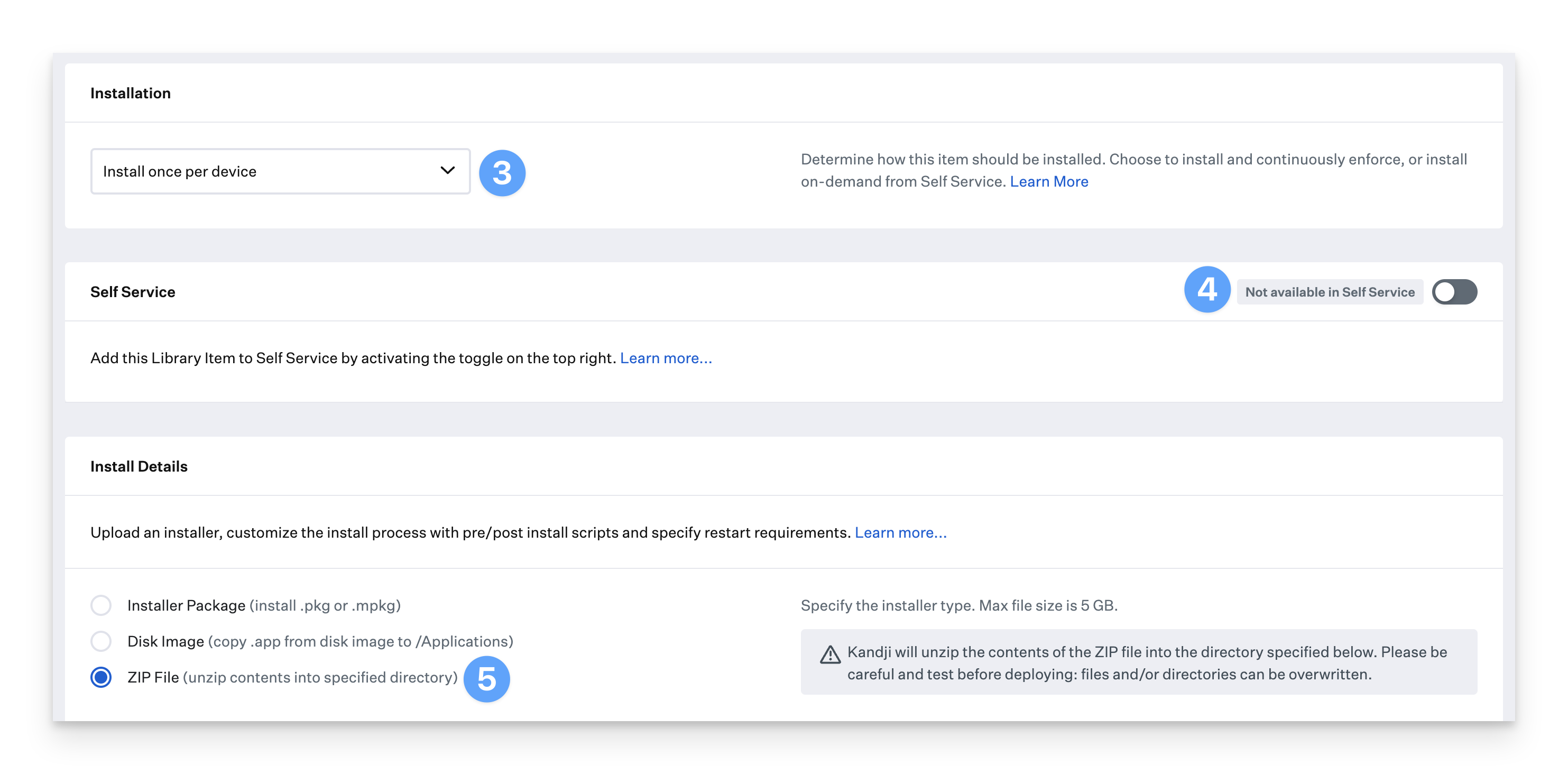 Optionally, toggle the option to make the library item available in Self Service, choosing any desired customizations.