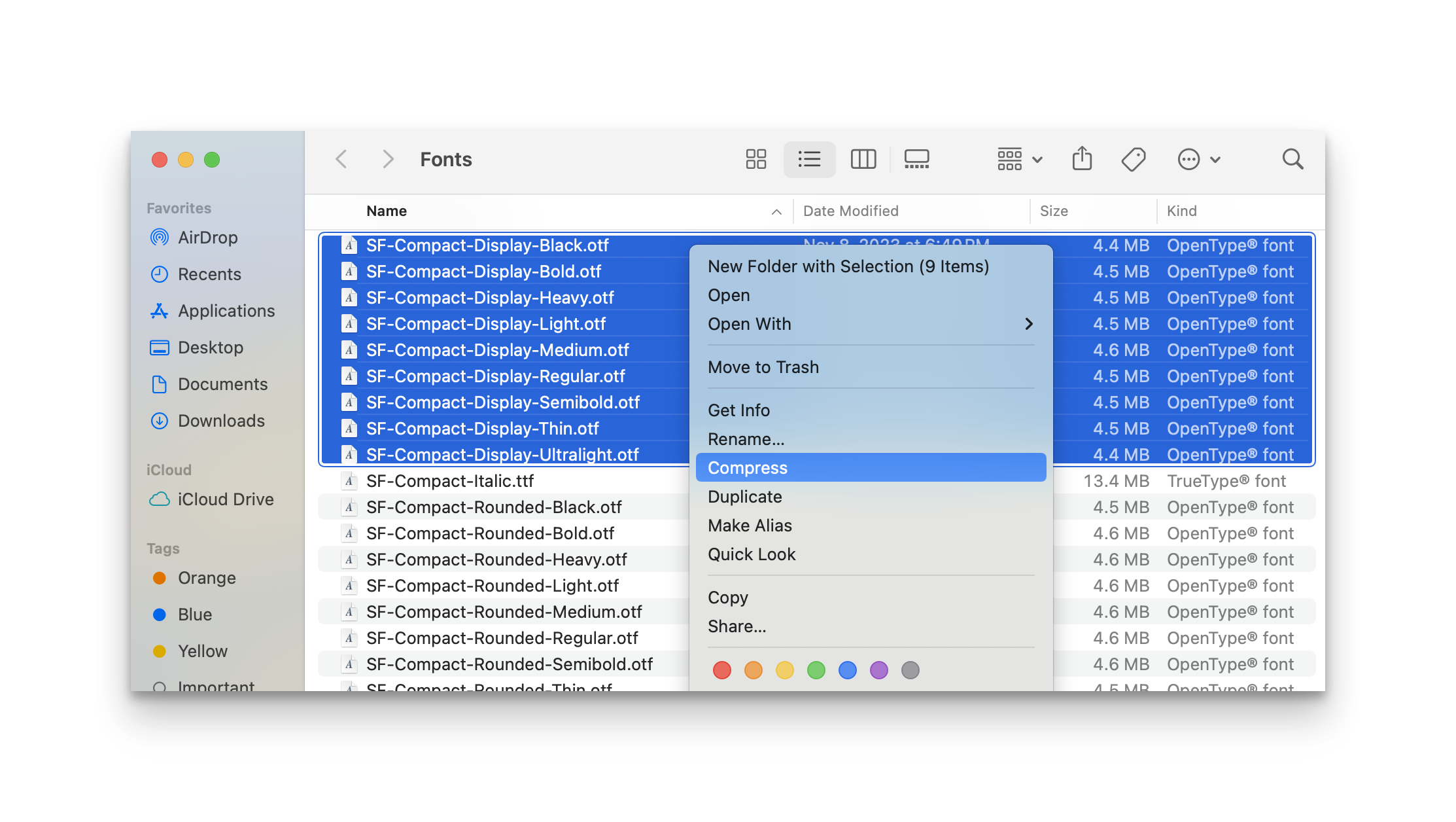 Select, then right-click your font files or folders and choose compress. Optionally, give your new ZIP archive file a descriptive name.