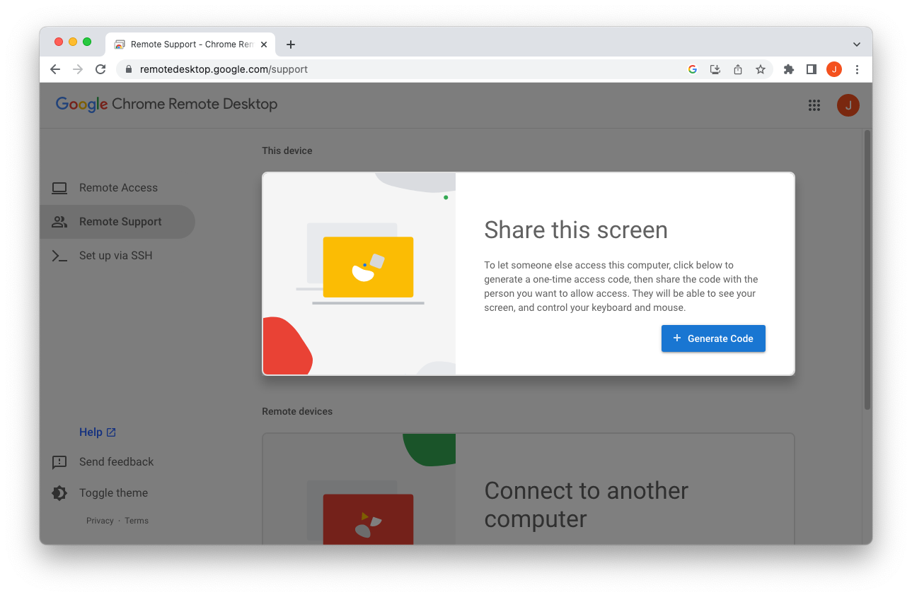 The end user navigates to the Google Remote Desktop portal in Google Chrome and selects ‘Generate Code’ within the ‘Share this screen’ section.