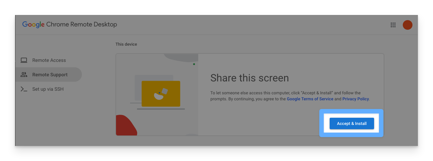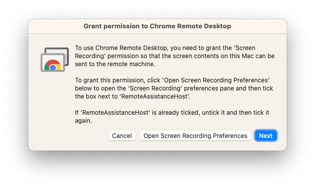 The first time a user attempts to share their screen using Google Remote Desktop, they will be required to confirm the access rights that Google Remote Desktop requires. The steps are outlined below.1
