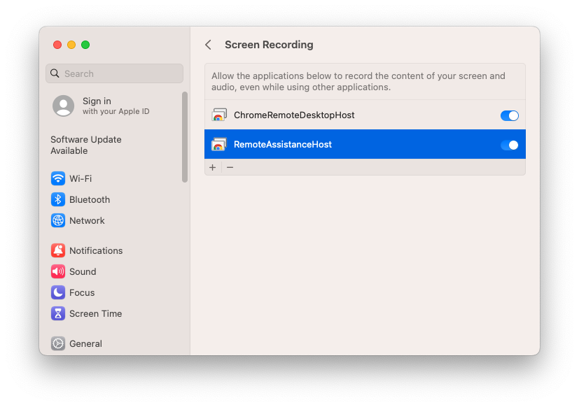The end user will see System Settings open on their device. The two options for ‘ChromeRemoteDesktopHost’ and ‘RemoteAssistanceHost’ should be enabled. Thanks to the privacy policy we deployed above, users will not need administrator rights to approve this.