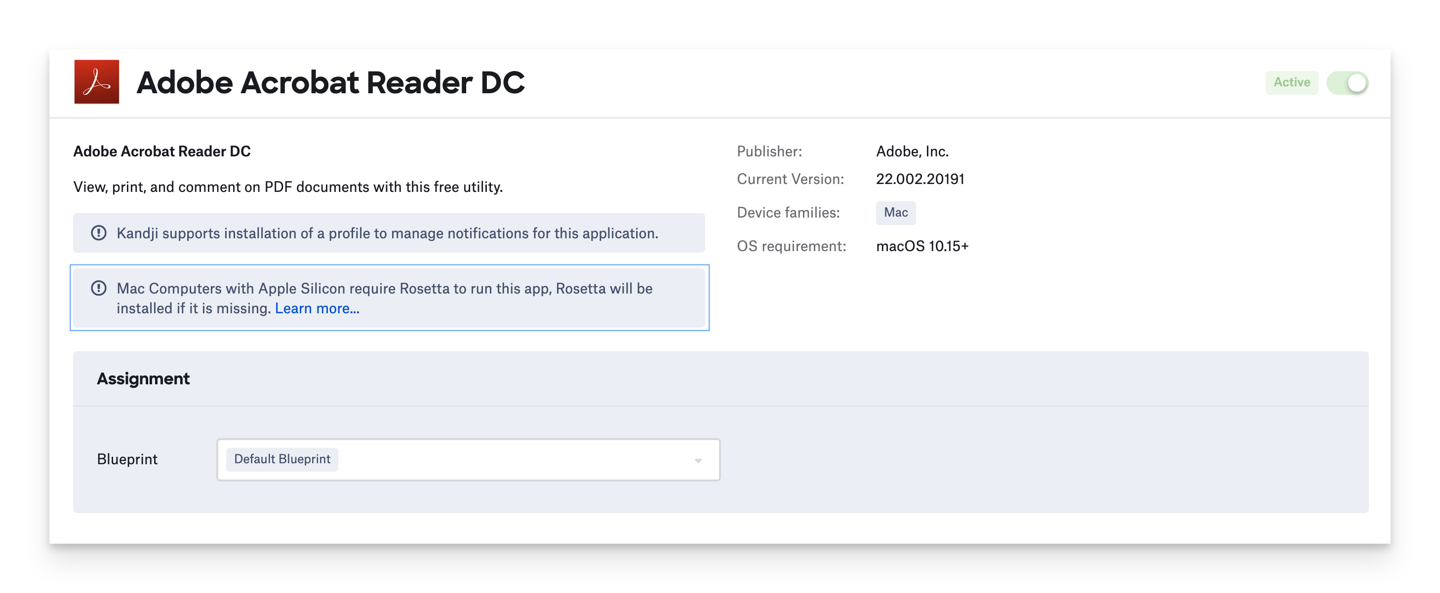 When an Auto App requires Rosetta 2 to run on a Mac computer with Apple silicon, you will see the warning below on the library item. In this event, the Kandji Agent will automatically check for and install Rosetta 2 as needed. Please note that these banners may be removed without notice as developers shift to universal binaries.