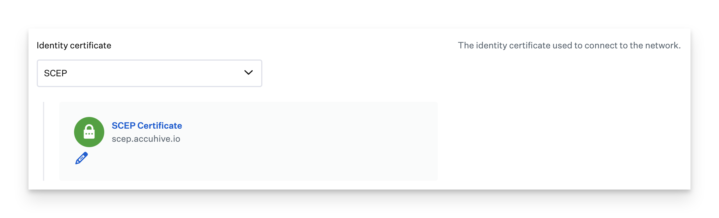 You can configure an identity certificate using AD CS, SCEP, or by uploading a PKCS #12 file. For instructions on configuring identity certificates, see our Using Identity Certificates for 802.1X Authentication support article.Configure SCEP