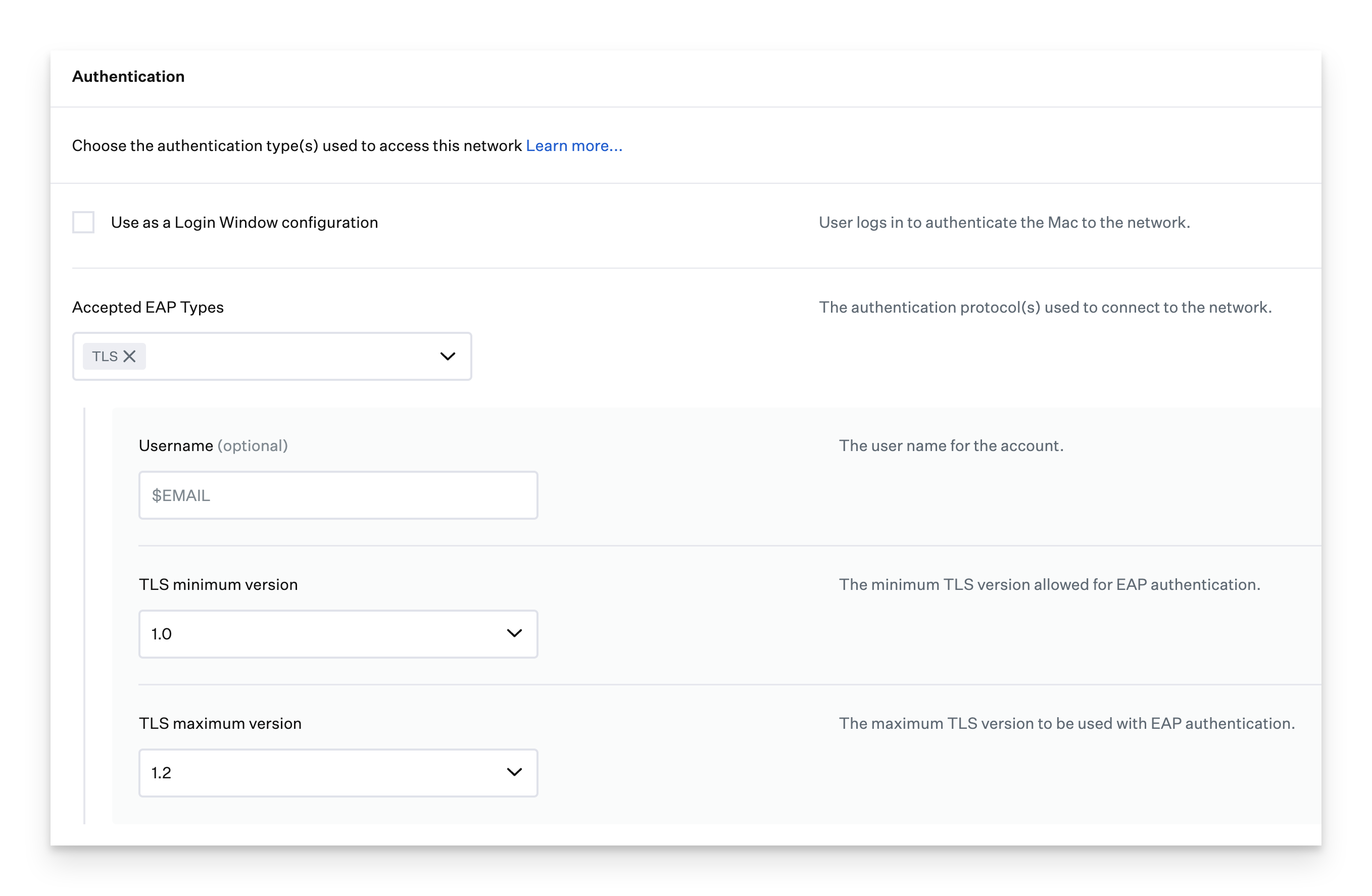 Select Allow trust exceptions if you want to ask the user whether to trust the authentication server if the presented certificate fails validation. This option is deprecated in newer versions of macOS and iOS.