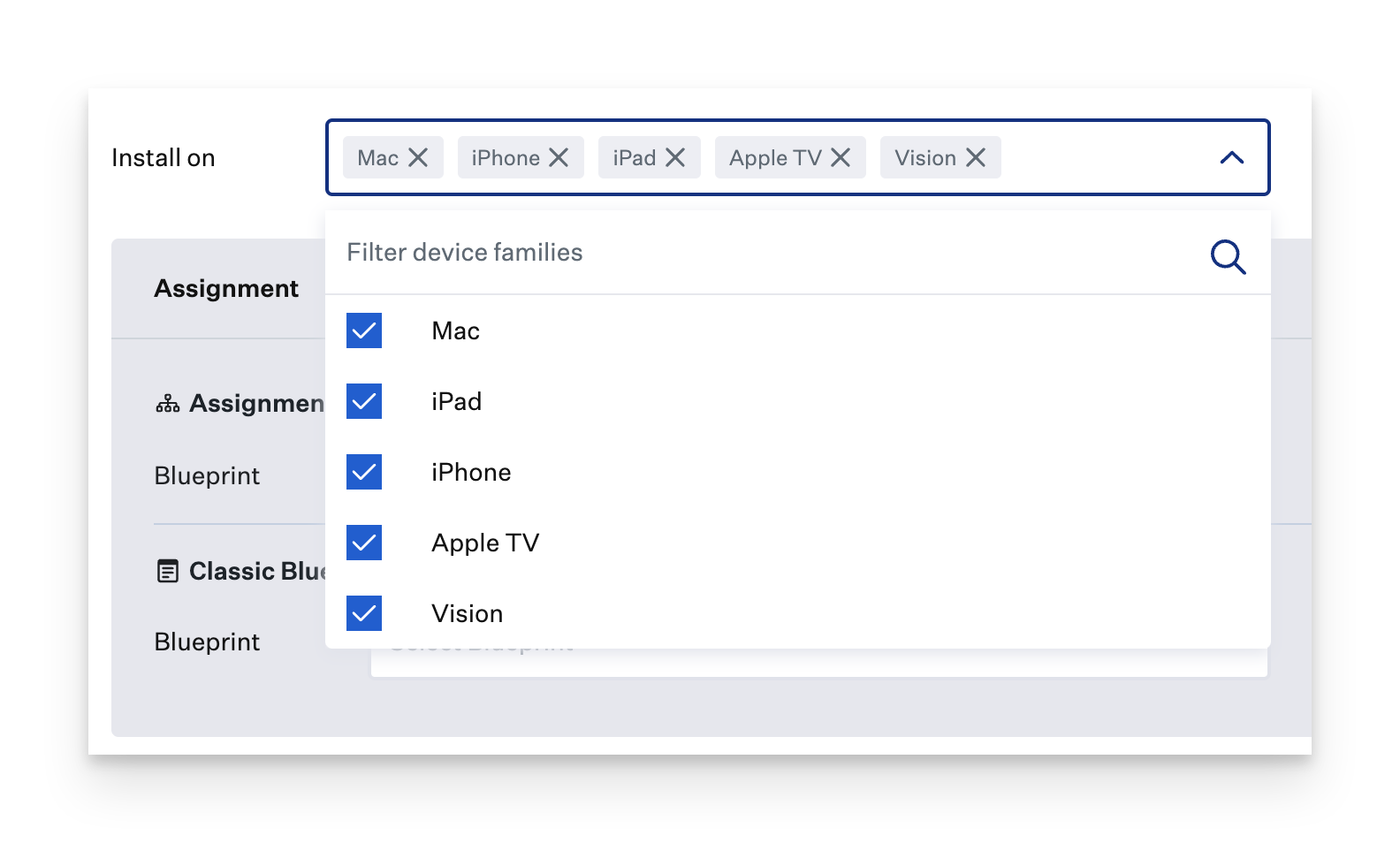 - Also, selecting or excluding a specific device family will change the Assignment Rules available to you
