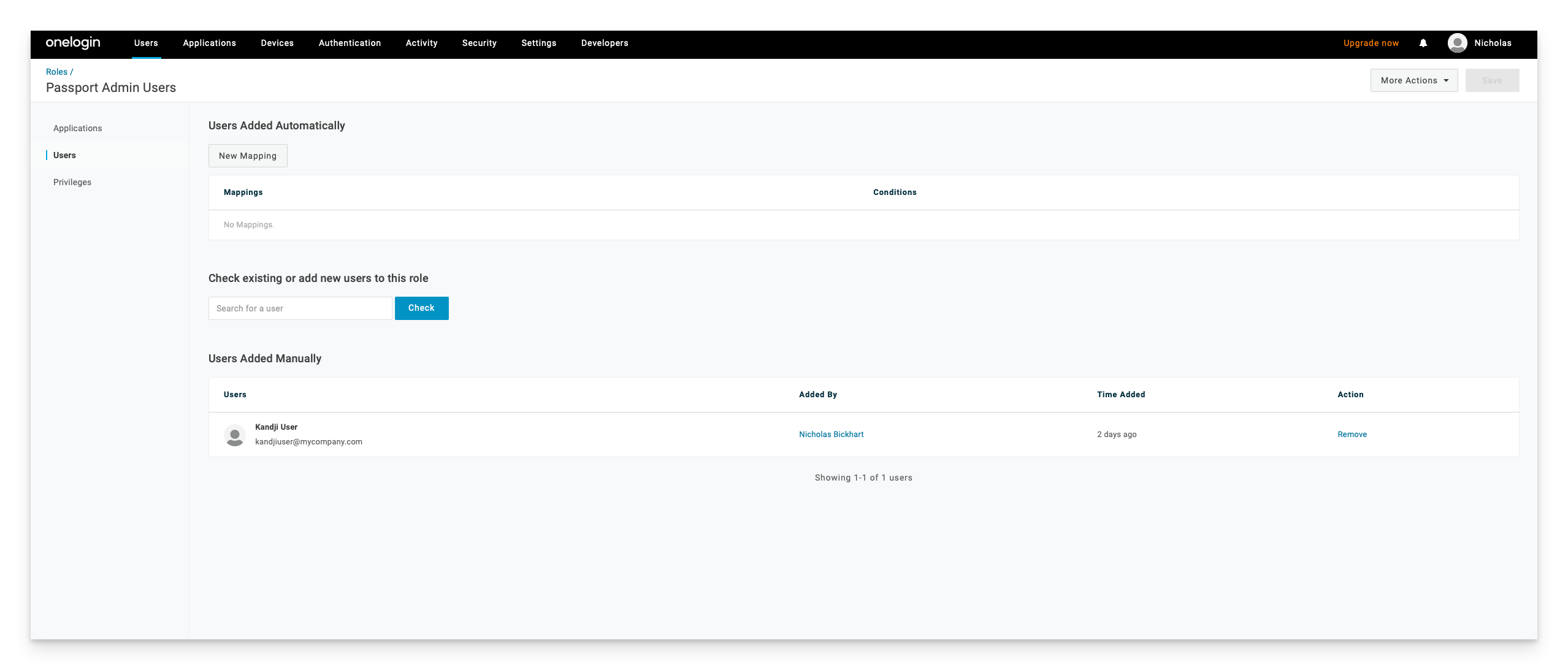 Finally, make sure your users are part of the role that you are creating, as well as a member of the Iru Passport application in OneLogin. To add a user to a role, you will need to select Users>Roles>Passport Admin Users in my example, select the Users link, search for the user, click the blue check box, click the Add to Role link, and then click Save at the top right of the page.
