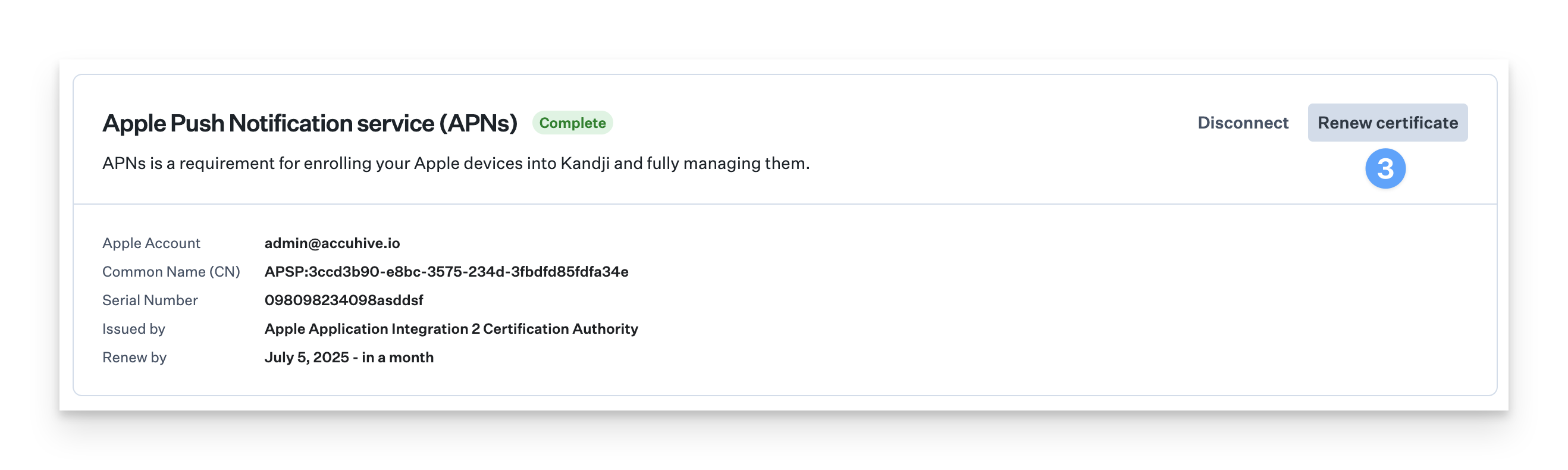 Only disconnect your APNs certificate if you need to replace it with a new one. Replacing your APNs certificate will break MDM communication on all of your enrolled Apple devices. You will need to re-enroll all devices under the new APNs certificate.1