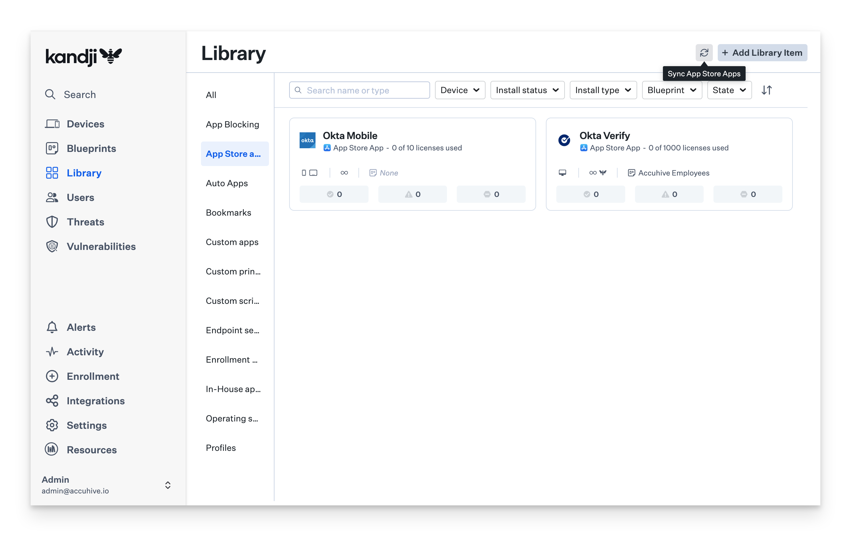 Iru Endpoint periodically checks for new apps or license changes. If you need to trigger a sync between Iru Endpoint and Apple Business Manager immediately, you can use the Sync App Store Apps button (double arrows) next to the Add Library Item button.