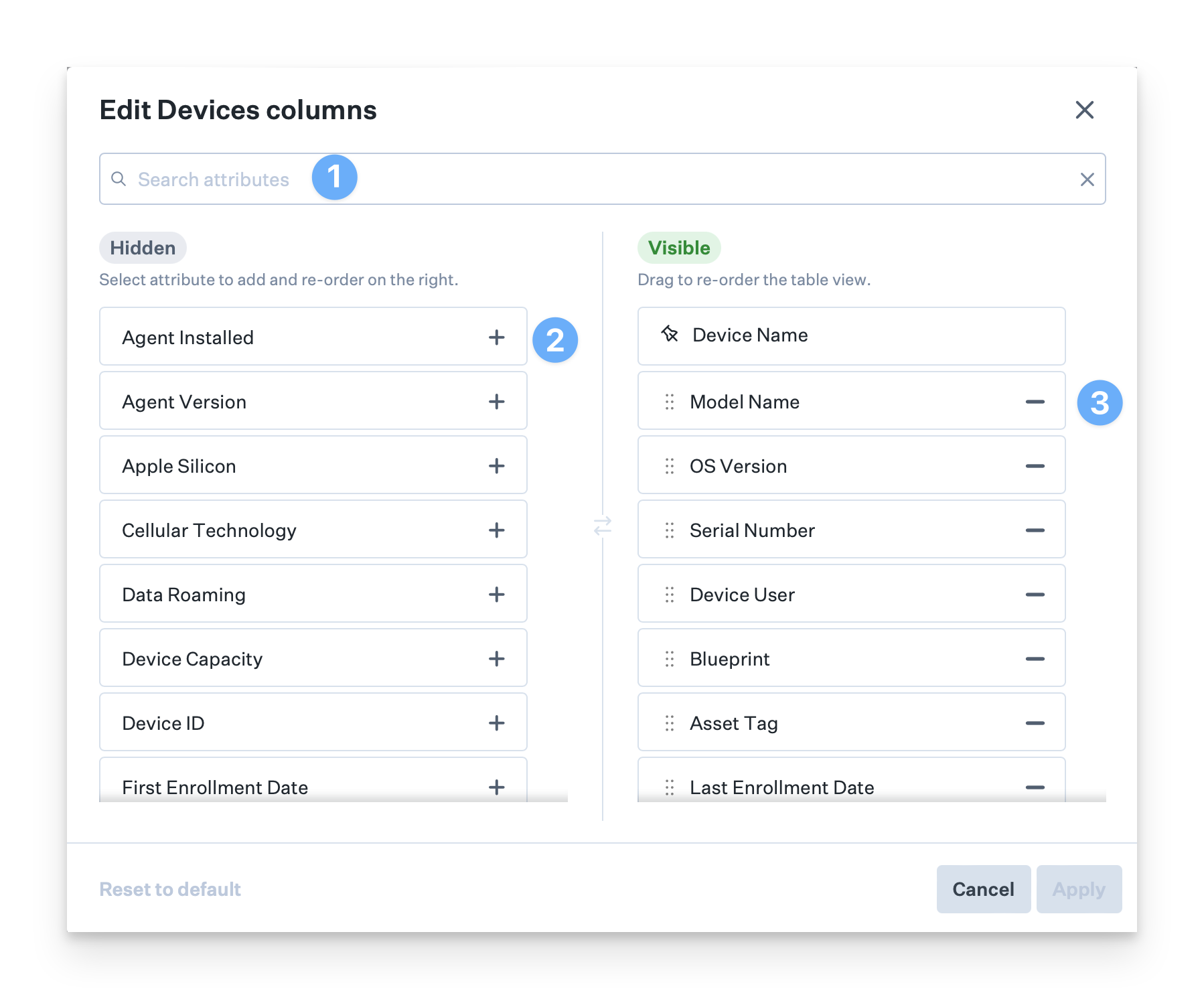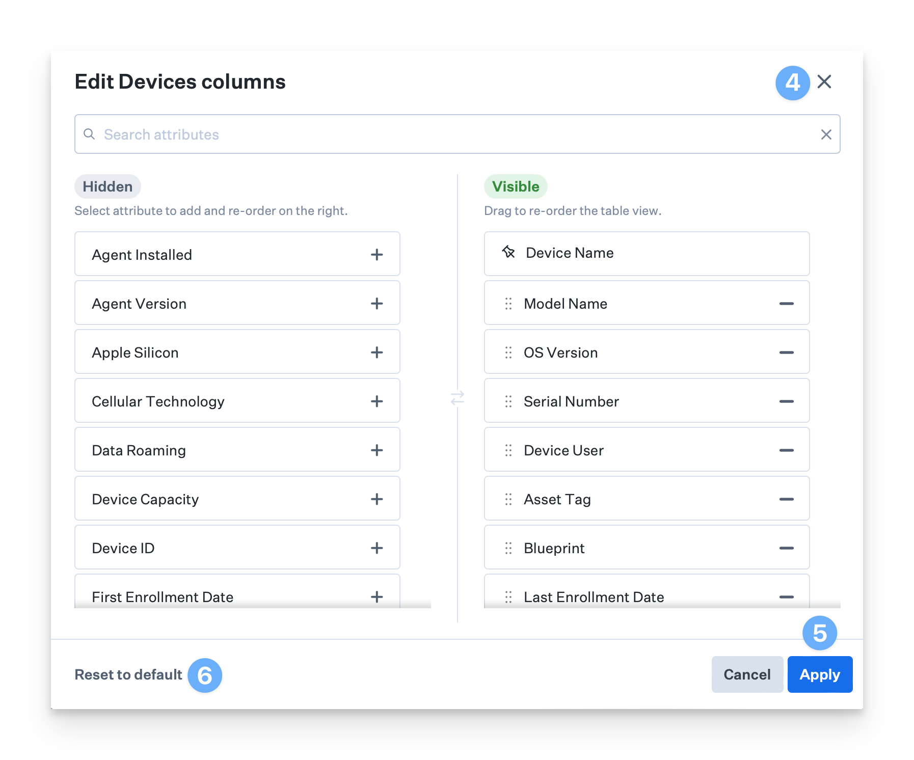 When clicked, the column selector will open the column selection dialog. This modal dialog allows you to select the specific attributes you want visible in the table for the current category.1