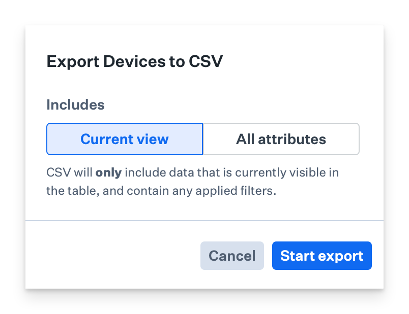 The CSV export button allows you to export all the contents of the category you are viewing. You can choose whether to include the currently displayed columns or all attributes of the category.