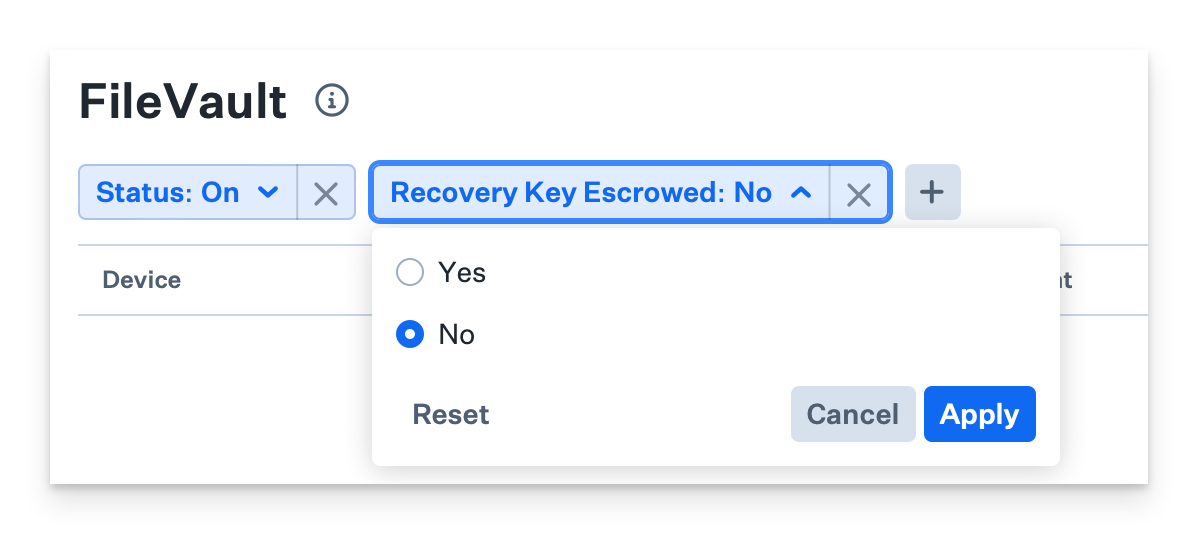 The Add Filter button allows you to filter the results of the table based on the value of any attribute within the category. For example, within the FileVault category, you may want to create a filter that shows you where FileVault is ON but Iru does not yet have the FileVault Recovery Key escrowed.
