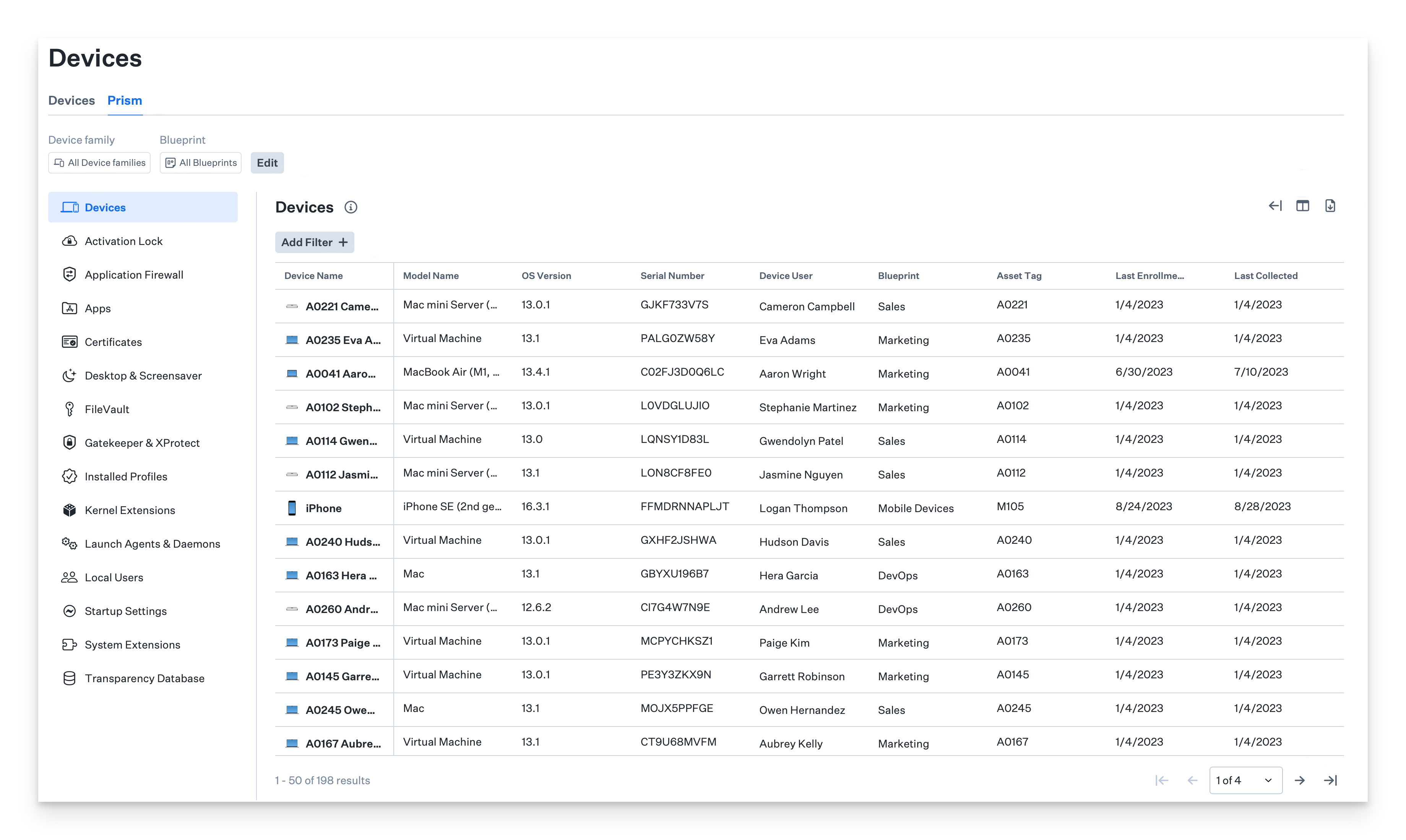 Prism currently exposes the following data categories that power Iru AI’s capabilities:- Devices: General information about your enrolled devices–this section will eventually replace the main devices page within Iru Endpoint.